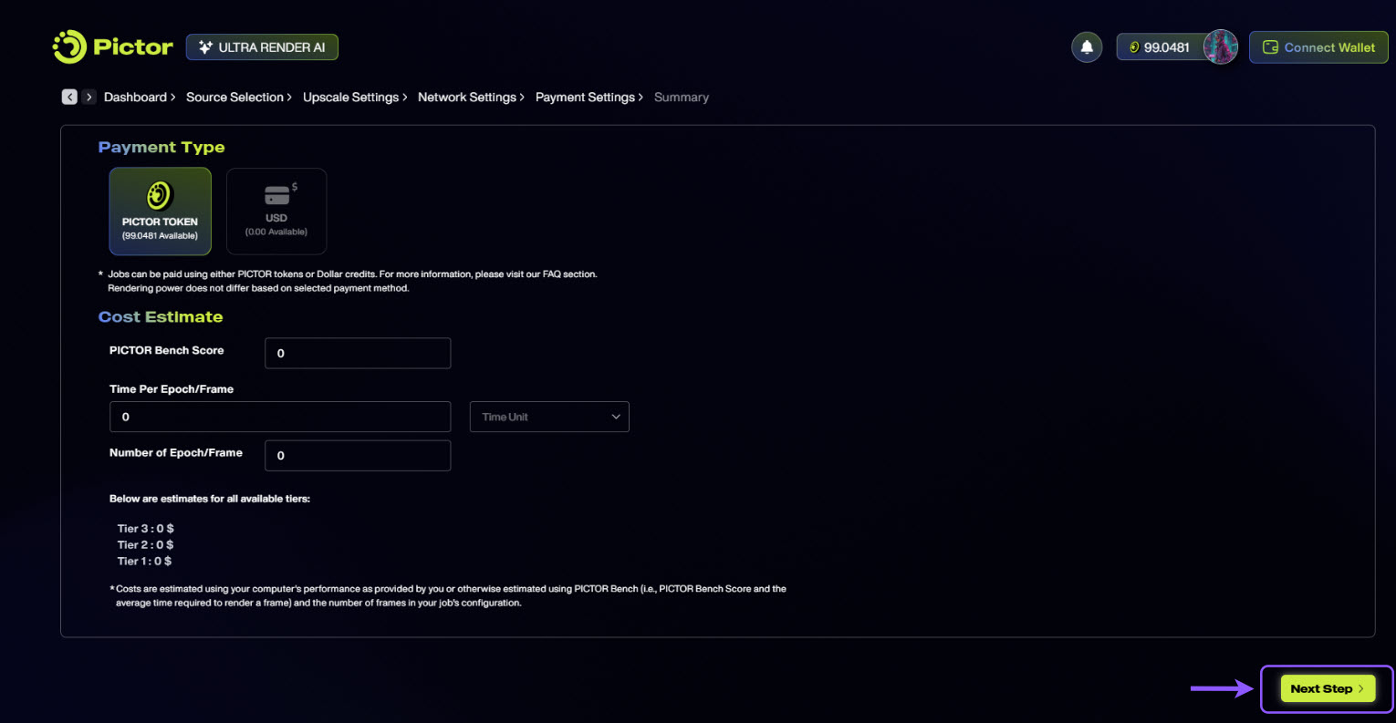Select either PICTOR tokens or USD to pay for the upscaling service.